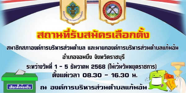 สถานที่รับสมัครเลือกตั้ง สมาชิกสภาองค์การบริหารส่วนตำบลแก้มอ้น และนายกองค์การบริหารส่วนตำบลแก้มอ้น อำเภอจอมบึง จังหวัดราชบุรี ระหว่างวันที่ 1- 5 ธันวาคม 2568 (ไม่เว้นวันหยุดราชการ) ตั้งแต่เวลา 08.30 - 16.30 น. ณ องค์การบริหารส่วนตำบลแก้มอ้น