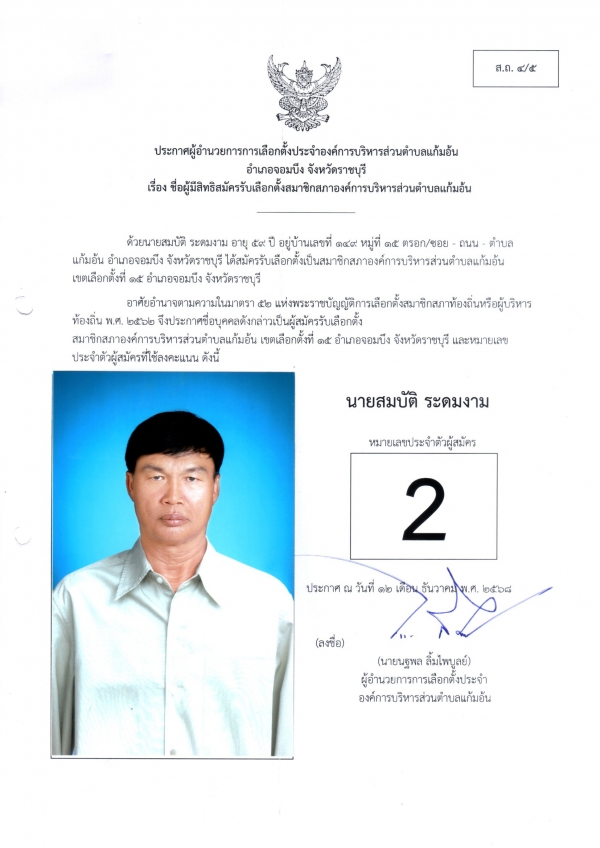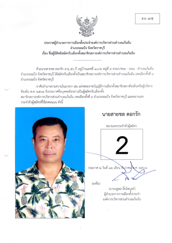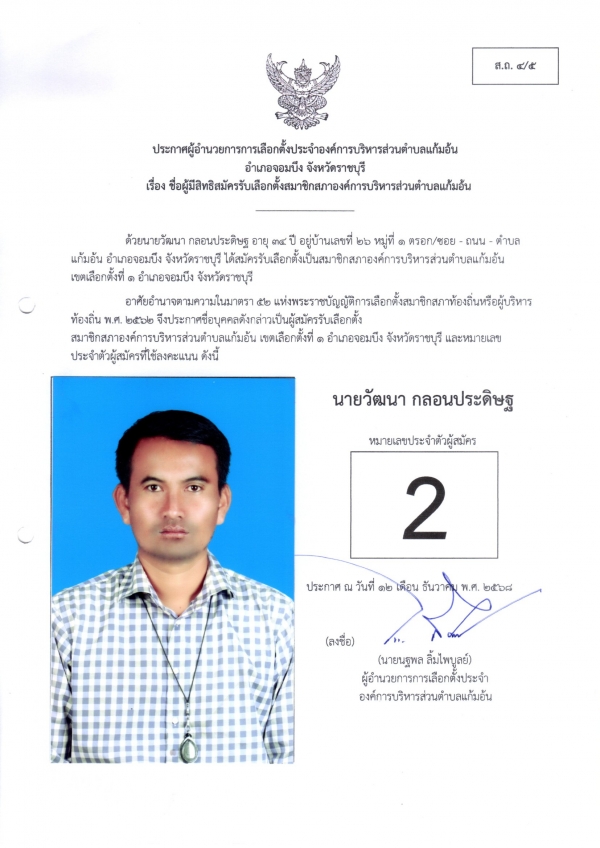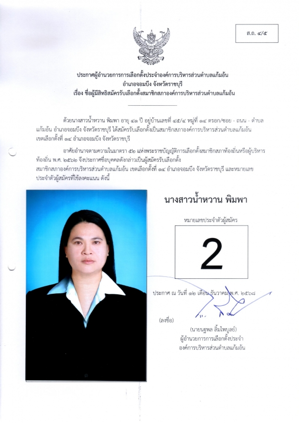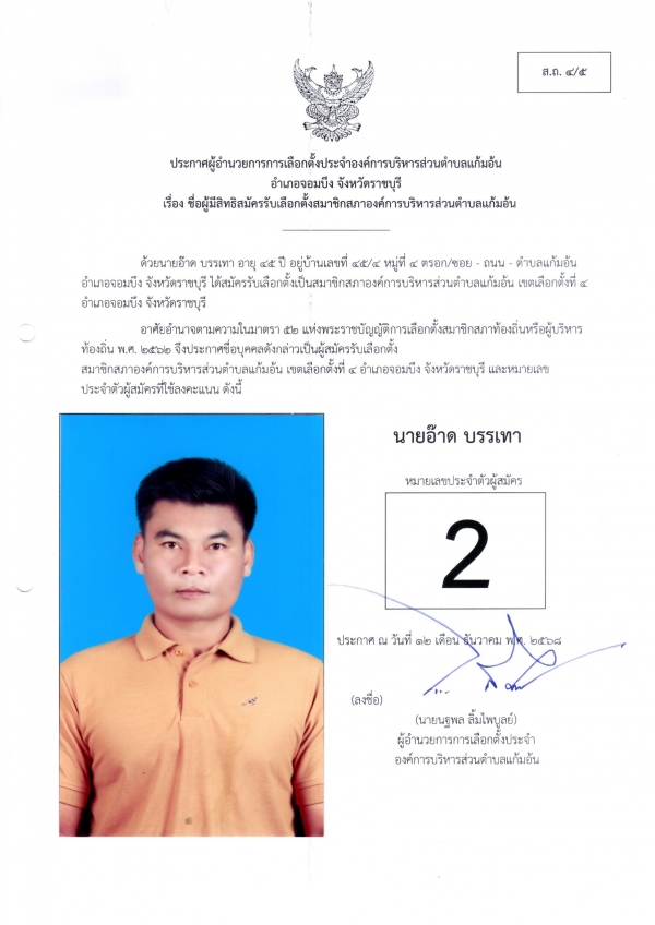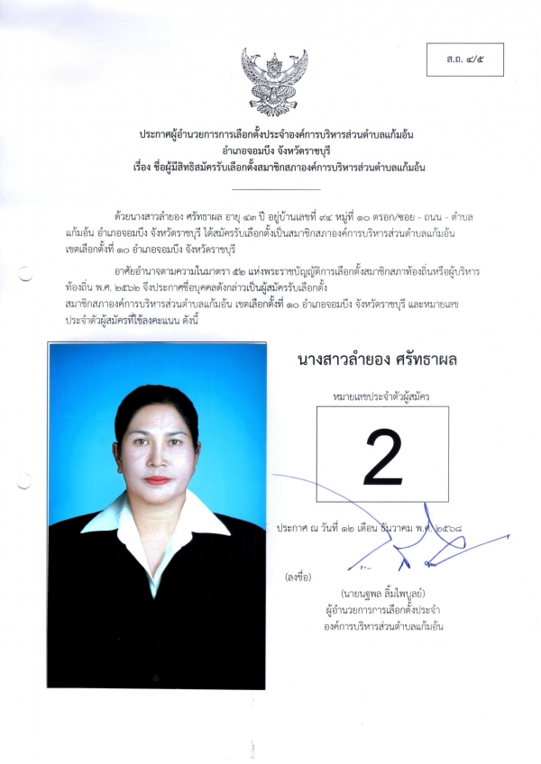 2.ประกาศผู้อำนวยการเลือกตั้งประจำองค์การบริหารส่วนตำบลแก้มอ้น เรื่อง ชื่อผู้มีสิทธิสมัครรับเลือกตั้งสมาชิกสภาองค์การบริหารส่วนตำบลแก้มอ้น(ส.ถ.4/5)