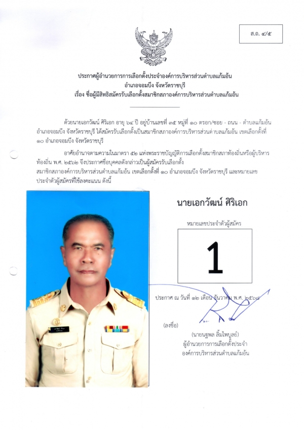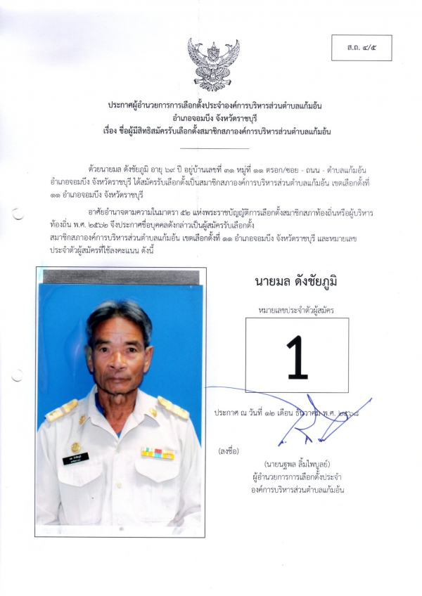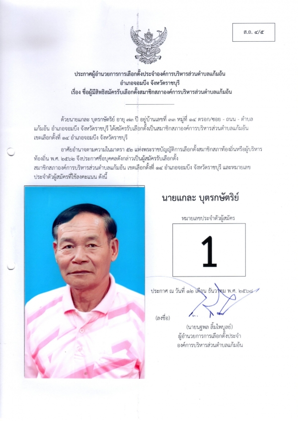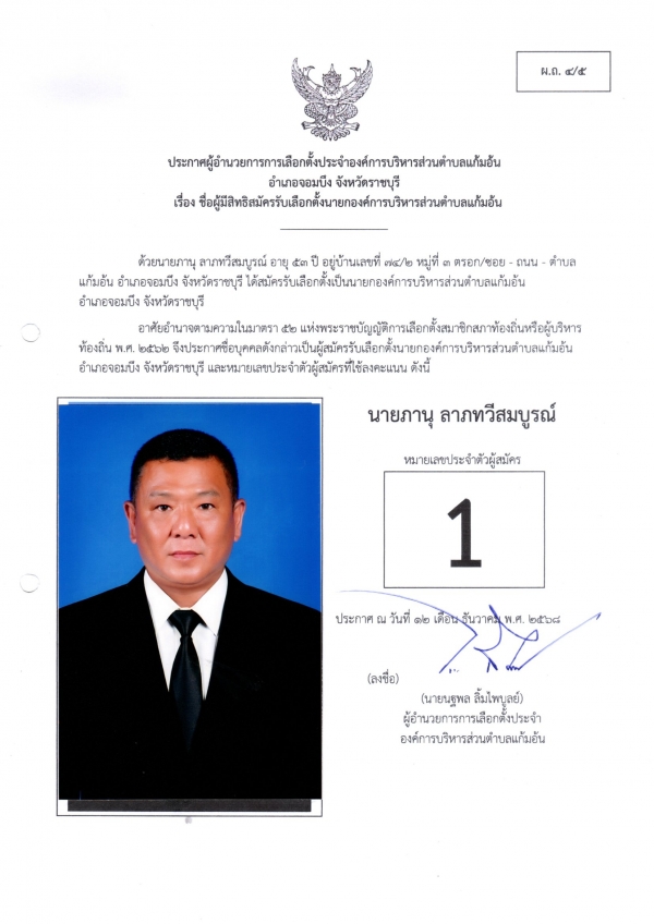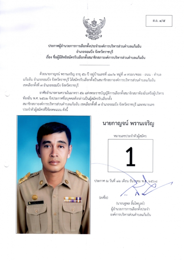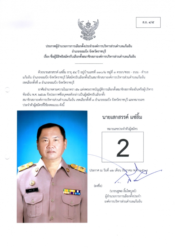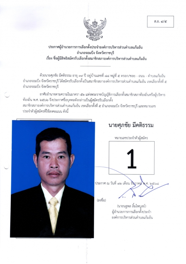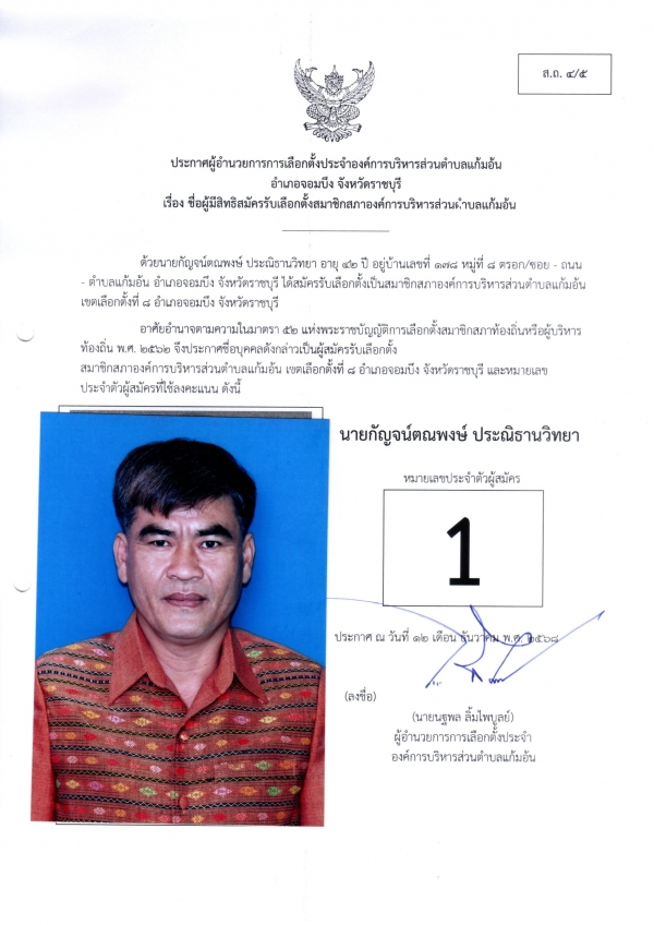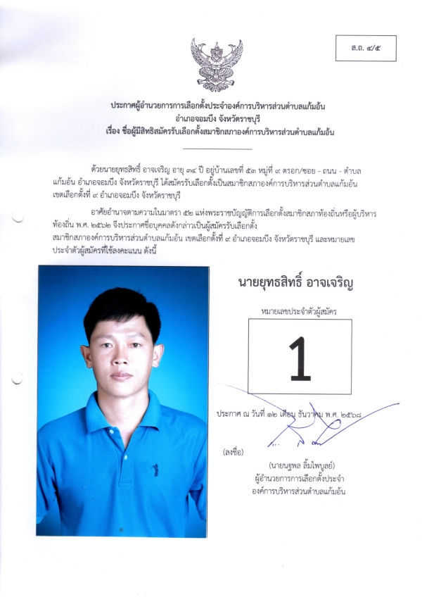 ประกาศชือผู้มีสิทธิสมัครรับเลือกตั้งนายก และชื่อผู้มีสิทธิสมัครรับเลือกตั้งสมาชิกสภา อบต.แก้มอ้น ส.ถ.ผ.ถ.4/5