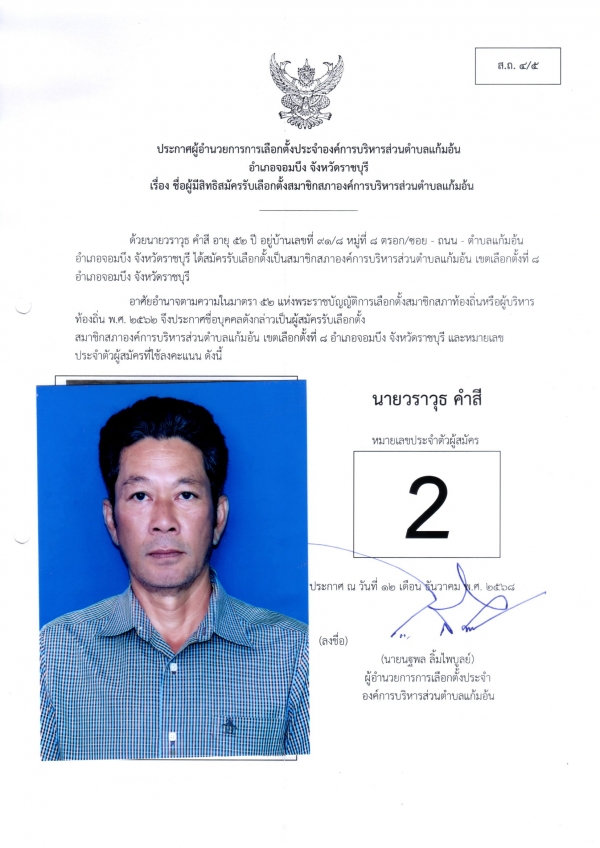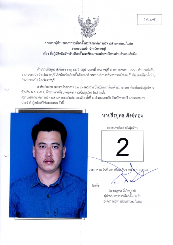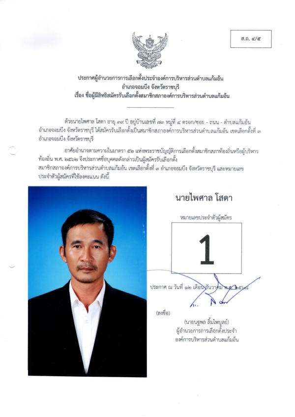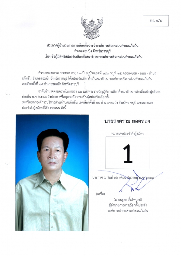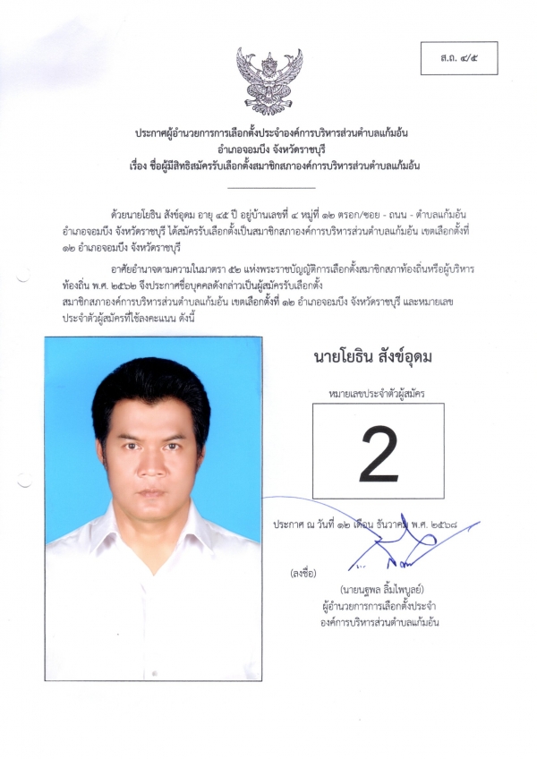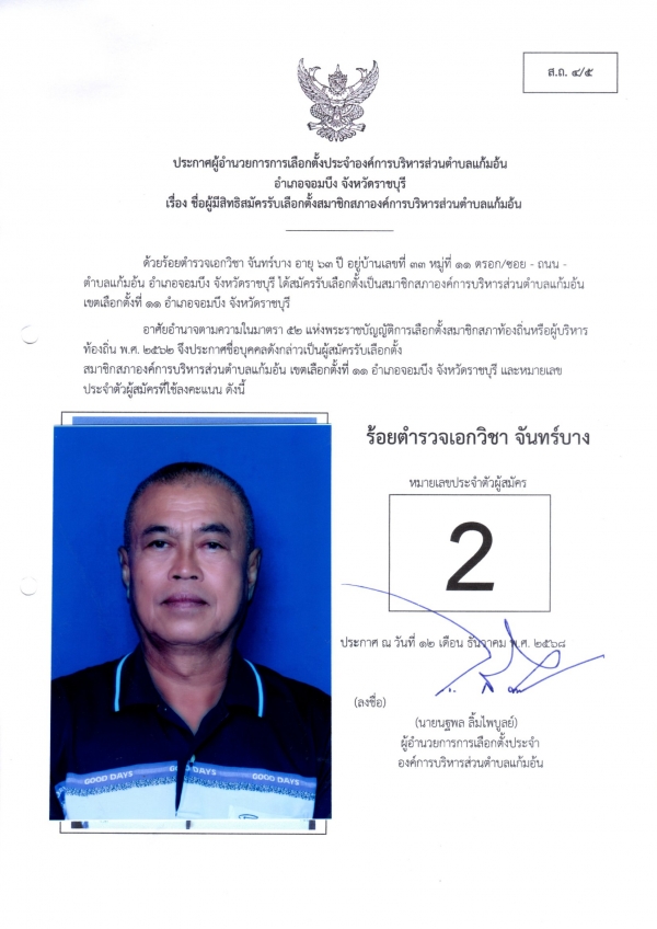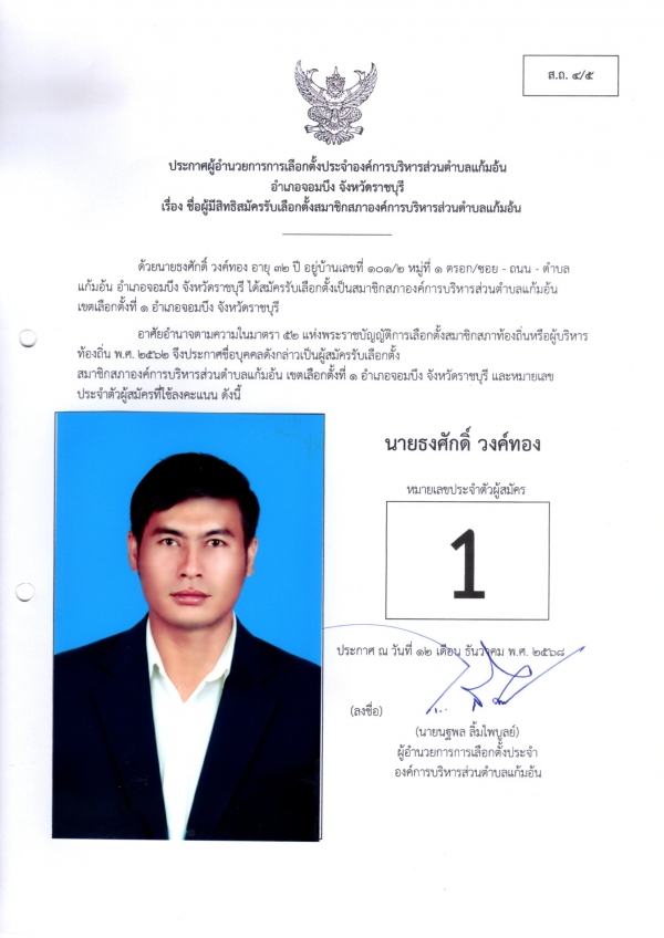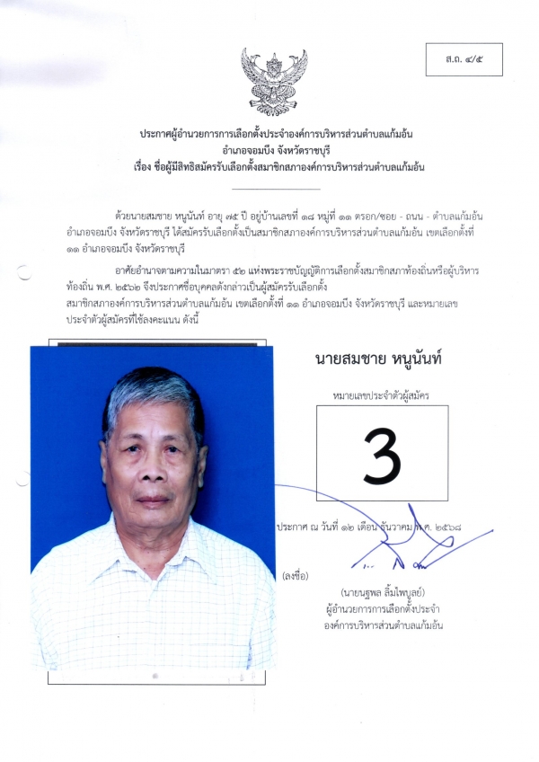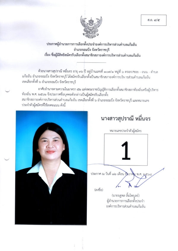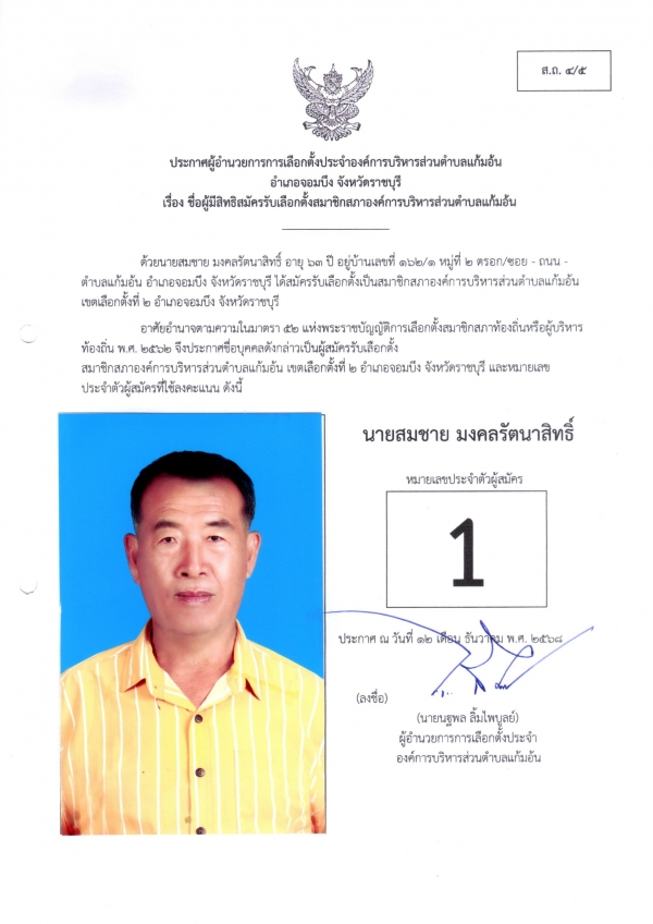 ประกาศชือผู้มีสิทธิสมัครรับเลือกตั้งนายก และชื่อผู้มีสิทธิสมัครรับเลือกตั้งสมาชิกสภา อบต.แก้มอ้น ส.ถ.ผ.ถ.4/5